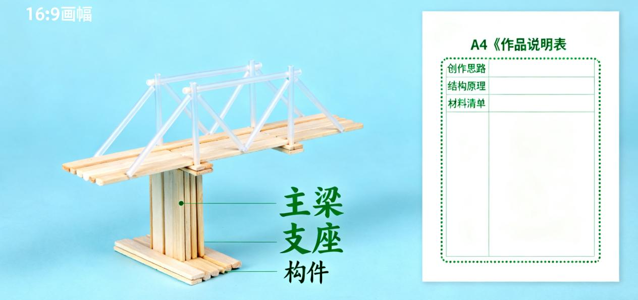 材料选择:无强制限制,鼓励使用环保材料、低成本材料(如卡纸、瓦楞纸、竹签、雪糕棒、废旧包装等),也可结合专业工具辅助创作,兼顾创意与实用性;